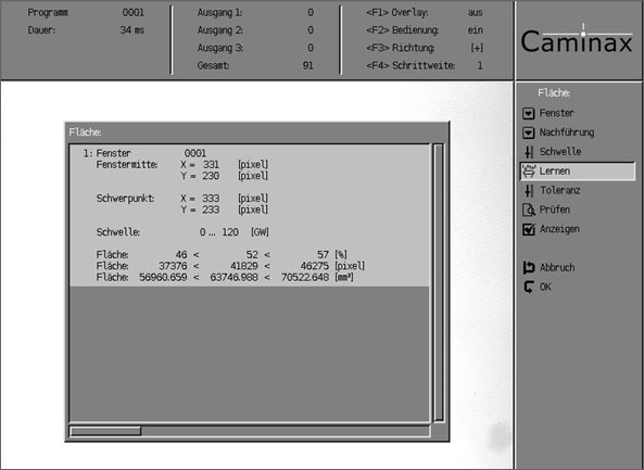 Das Einlernen > gestaltet sich ebenso unkompliziert: Durch Drücken des Buttons "Lernen" merkt sich Caminax die zulässigen Werte für Ihr Prüfobjekt und zeigt Sie Ihnen an...